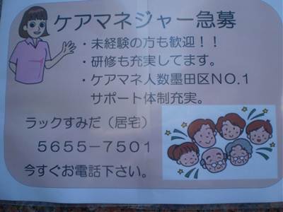 ラックすみだ居宅介護支援では 2012年10月26日 / カテゴリー:ラックすみだ ラックすみだ居宅介護支援では毎週金曜日午前に ケアマネミーティングを行っています。 笑顔の素敵なレディばかりです(=^. .^=)ミャー そして、 ラックすみだ居宅介護支援では 一緒に働いて下さる方を募集いたしております。 チームワークの良い楽しい仲間です。 ご紹介や、応募のお電話 お待ちしていま~す(*ノΘ`)