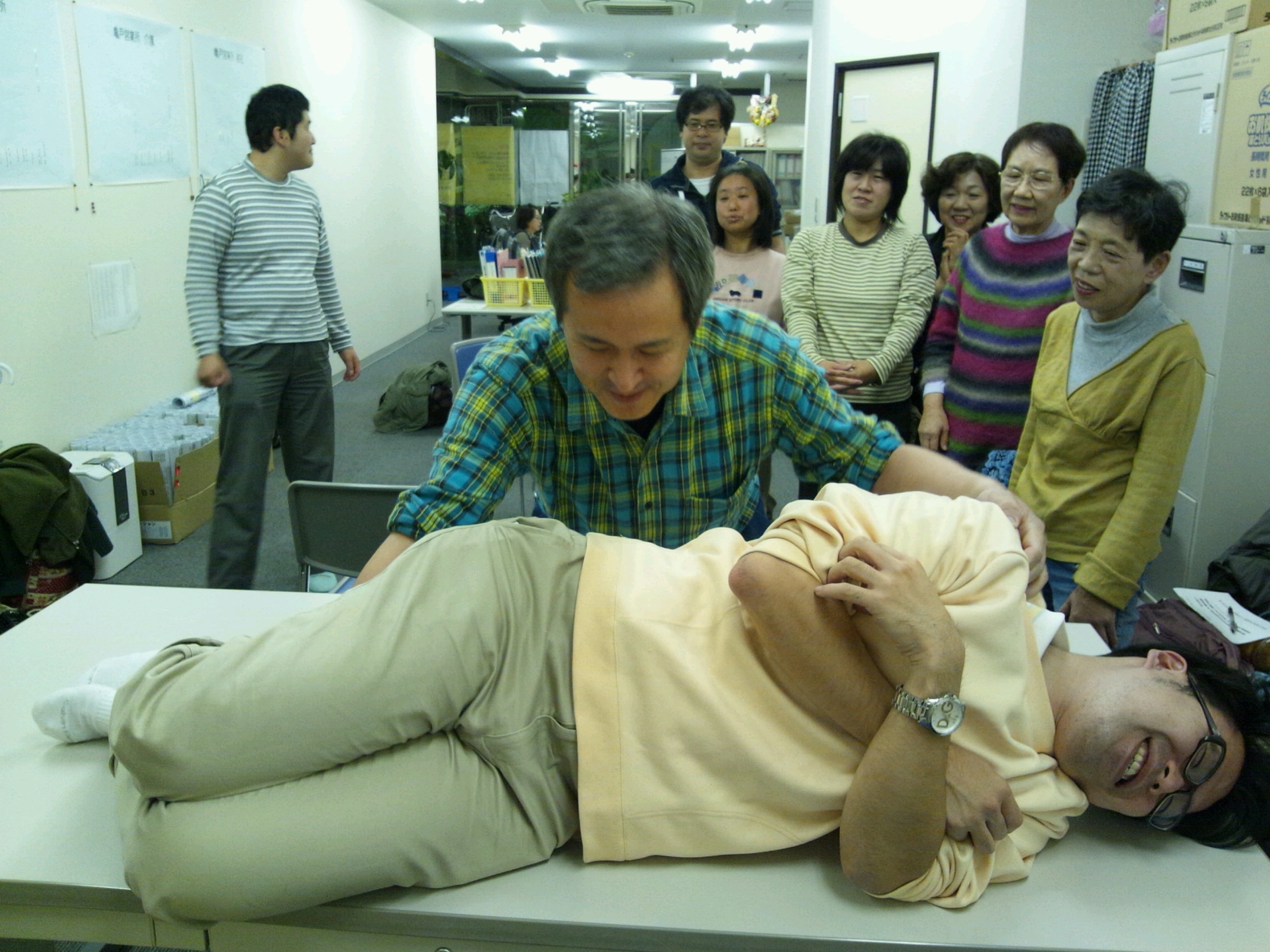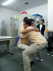 ラック亀戸 ヘルパーミーティング 2013年11月16日 / カテゴリー:ラック亀戸 11月のヘルパーミーティングは「食中毒に関する講義とボディメカニクスの実技練習~座学と実習の2本立て~」 ⇑⇑課長の熱い視線が注がれる中、基本に沿って立ち上がりの動作を実演中。 おまけとして最後に体位交換の練習を行い、 優秀ヘルパー賞3年連続受賞者の実技に所長もご満悦な様子。 私たちと楽しく愉快に介護を学びましょう! 毎月違った内容の研修等を行っています。参加者募集中!!