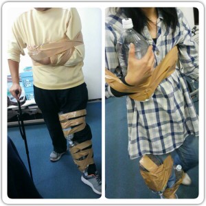 水が入ったペットボトルを腕や足に固定し歩いてみる事に・・・