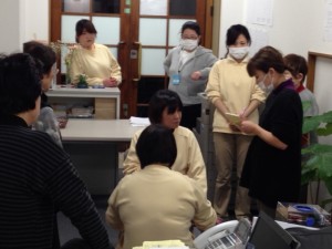 その点を、誰が、現場に入っても、皆さん、同じ介護内容としてサービス提供が出来るように、実技および、その利用者の持っている残存機能を生かしながら、サービスを提供できるように、なごやかな雰囲気のもとに、話し合いと実技をして、共通認識を高め合いました。