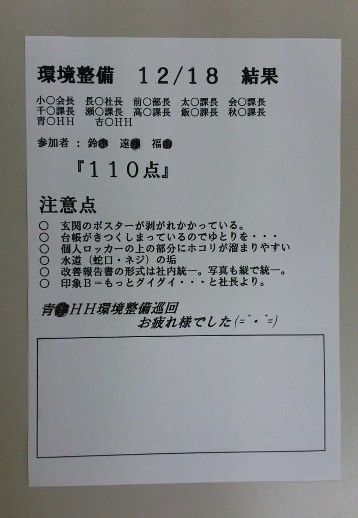 なので、環境整備の結果表を作成し、ランチ中に反省会を行い今後の改善策を話し合いしました。