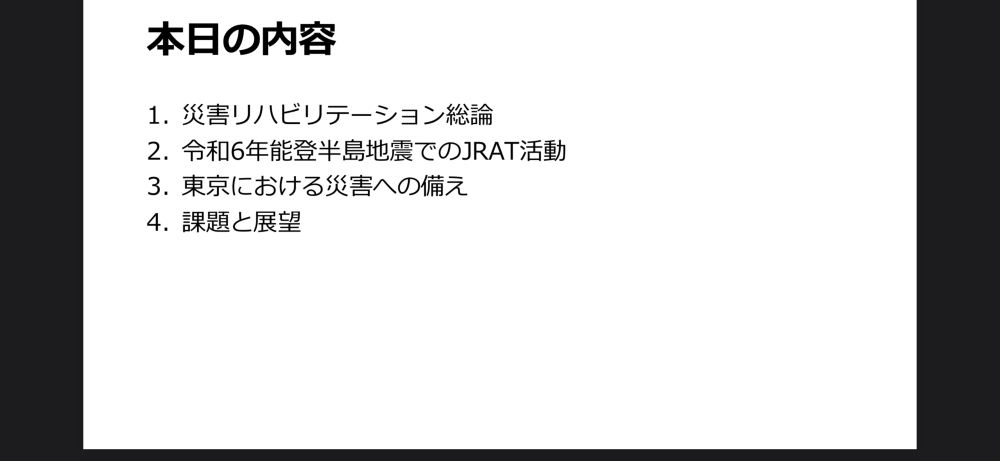 JRATっていう組織で災害時に活躍するチームの方が講師で、災害時の多職種連携について2時間色々お話を聞けました。