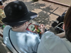 昼食は公園でお弁当を食べました。外で食べるとおいしいねぇ~♪とAさん。みなさんで美味しく頂きました。