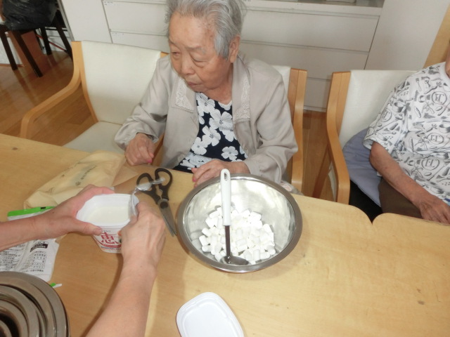 フワフワの白いものに 2018年7月11日 / カテゴリー:ラックの花 平井 これまた、ある日のラックの☆花平井☆の風景... 「これ、入れて下さいね」 「これ、入れんのね...」 # ボウルの中は、フワフワの白いものでいっぱい... 「じゃ、入れるよ~」 っと、ヨーグルトを投入。 さて、このあと、どうなるのかな。 お楽しみに~♪