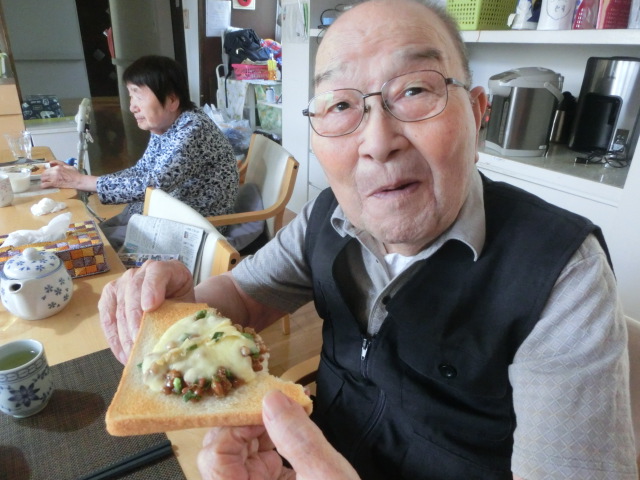 納豆で 2019年5月28日 / カテゴリー:ラックの花 平井 さて、時は移って、令和元年は5月27日の朝の事。 平成31年3月のある朝、撮り忘れた写真を撮りました♪ 朝ごはんの定番、納豆の華麗なる変身をご覧あれ。 これで~す!! その名も「納豆でトースト@ラックの☆花平井☆風」♪♪ 「ほんっとに、美味いよ、これは。 最高だね♪♪」 と~っても大好評♪♪ 食べたい方は、こちらへど~ぞ(^^♪