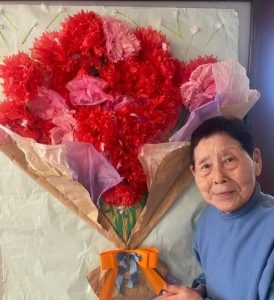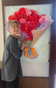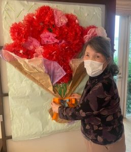 スタッフのひろ美さんがご利用者様と一緒に作ったカーネーションの花束と