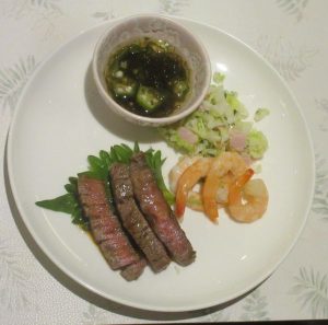 メインはヒレステーキと海老のアヒージョ風、副菜はさっぱりもずく酢とコールスローサラダ
