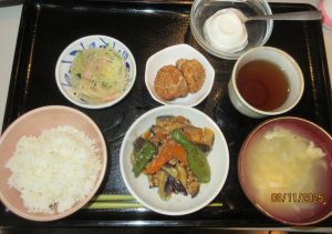 ・麻婆茄子・春雨サラダ・胡麻団子・かきたま汁・杏仁豆腐