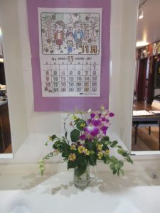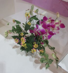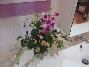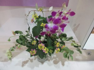 作品紹介(生け花) 2025年12月1日 / カテゴリー:ラックの空 平井 こんにちは。ラックの空平井☁こでまりです。 お花の紹介に続きまして、スタッフの恵子さんがキレイに生けてくれた作品のご紹介です。 じゃん🌸 見える角度が変わってもステキ💖 皆さんに見ていただけるよう、洗面台に飾られています。 今回のお花は、頂き物のデンファレに、敷地内に咲いていた草花を合わせて生けてくれました✨ 不定期ですが、これからもご紹介していきたいと思っています。お楽しみに😊