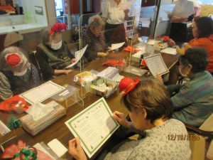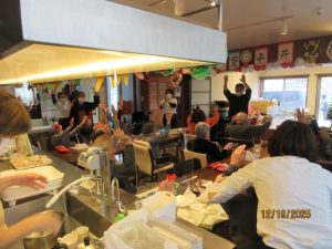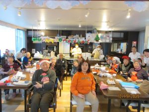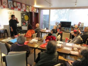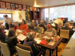 クリスマスソングの合唱♪お手元に歌詞カードをお渡しし、「赤鼻のトナカイ」「きよしこの夜」を一緒に歌いました。笑顔と共に楽しい歌声が響いていました♪