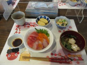 ランチマットも節分色で、昼食は海鮮丼。お刺身が輝いていました(新鮮)✨